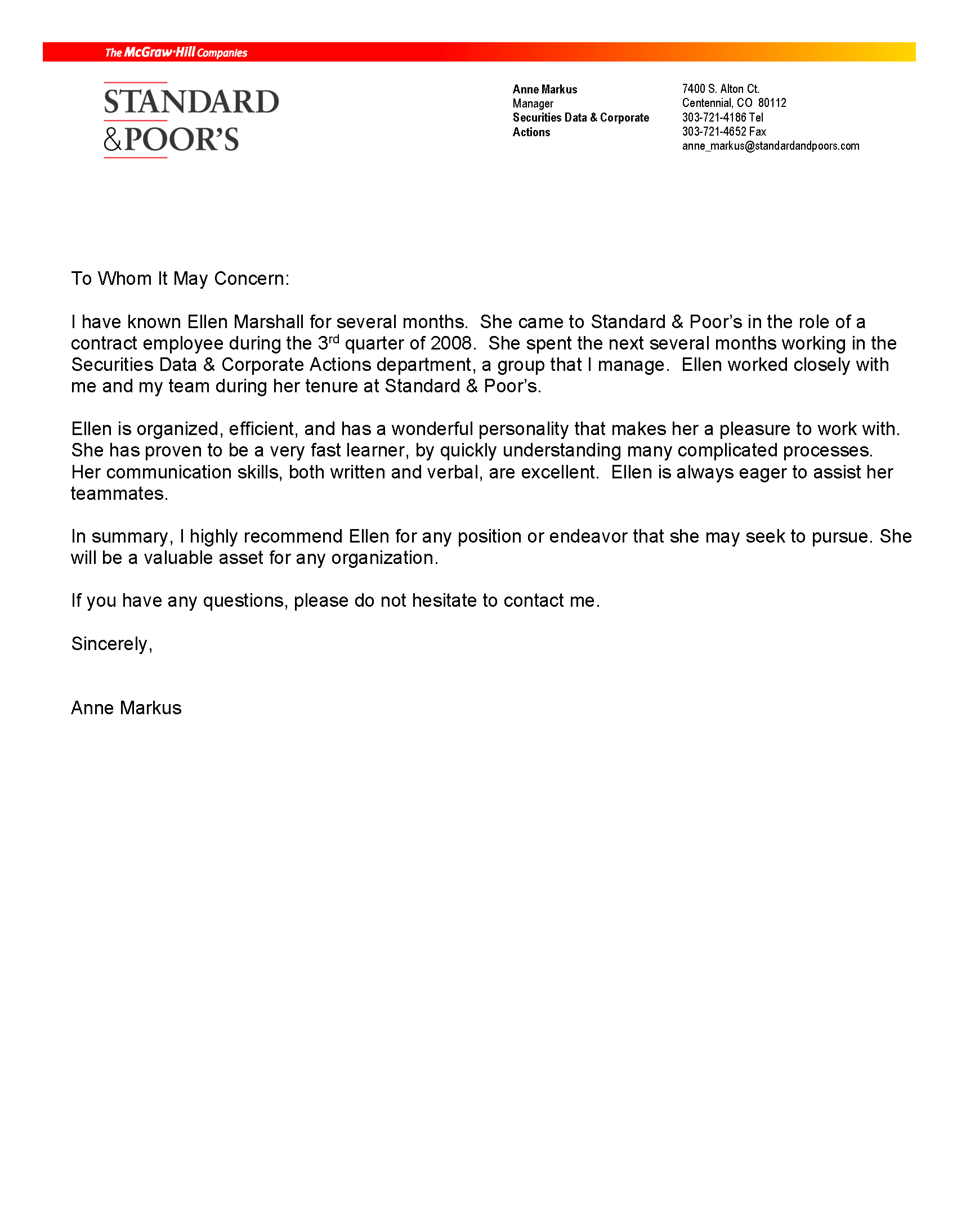 Letter of recommendation on Standard & Poor's letterhead, recommending Ellen Marshall for employment, signed by Anne Markus.